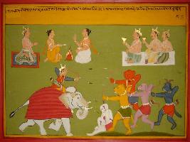 | Description / विवरण | Miniature painting based on Mahabharat - Rajdharma parva. Raja Bhagirath depicted performing yagna. Indra is depicted drinking Amrit with gods and after drinking Amrit he had killed many demons in a war. |