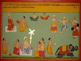 | Description / विवरण | Miniature painting based on Mahabharat - Rajdharma parva depicting Raja Dilip and Raja Mandhata and various alms that they have made. Some dancing people, an elephant and a king giving pillar line thing to bramans, two Brahman performing yagna had been depicted here. |