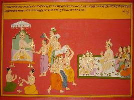 | Description / विवरण | Miniature painting based on Mahabharat - Rajdharma parva. A king Ambarik is depicted making various alms to poor peoples and Brahmans. king again is depicted with his queens and sons. |