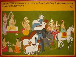 | Description / विवरण | Miniature painting based on Mahabharat - Rajdharma parva. A king is depicted sitting with peoples. He is also depicted with his queens on chariot followed by elephants, horses and cows. |