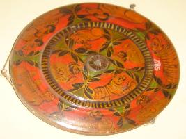 | Description / विवरण | Wooden chakri circular in shape painted in lacquered paint having floral and animal motifs on it. A circular depression is there around the body to tie the thread. A circular depression is seen at the top centre also. |