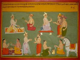 | Description / विवरण | Miniature painting based on Mahabharat - Rajdharma parva. A king is depicted here having his food, talking to his men, he has performed many yagna including Ashwamegh. |
