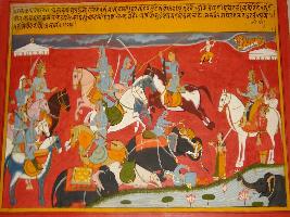 | Description / विवरण | Miniature painting based on Prithviraj Raso depicting the battle scene between the army of king Jaichand and Jaswant Rathore. The painting depicts that army of Jaichand can t defeat Jaswant Rathore and run away from the battle field. At the left top, by seeing the battle. Lord Mahadev is dancing. At the left side Prithviraj and Sanjogita are depicted. |