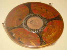 | Description / विवरण | Wooden chakri painted with lacquer paint having animal and floral motifs on it. A depression is around the body to tie the string. It was used as a playing item. |