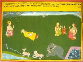 | Description / विवरण | Miniature painting based on Mahabharat - Rajdharma parva depicting importance of time. It also depicts that flowing of mines, fragency of women, death of men, happed according to time. No one can go before time and everything in life fixed with the time. |