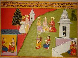 | Description / विवरण | Miniature painting based on Sanskrit drama Malti Madhav depicting Malti sitting with Lawangika in a palatial at lower right part. According to upper text, Malti is telling Lawangika that Madhav has given her a necklace. At the middle of painting, Lawangika is showing Malti s portrait to her. |