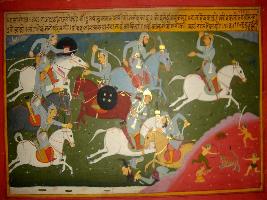 | Description / विवरण | Miniature painting based on Prithviraj Raso depicting fight between Prithviraj Chauhan and the Muslim forces of Ghauri on upper part. On the lower part a hunting scene is depicted, a tiger is been hunted by four people holding bow, swords, and gun. |