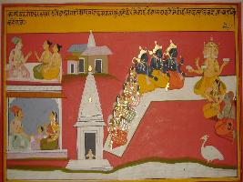 | Description / विवरण | Miniature painting based on Kashi khand depicting importance of Shiv shruti. At the left side, Brahma is shown sitting with Saraswati, Narad Muni, Vishnu and Apsaras. It depicts the scene of Devalaya. To its left, Shiv temple is shown to compare it with Devalaya. At the upper left, a man is shown talking with how sae. Below he is shown talking to his wife and son. |