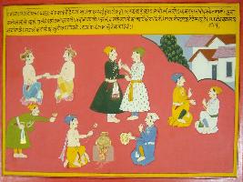 | Description / विवरण | Miniature painting based on Mahabharat - Rajdharma parva depicting Bhishma telling Yudhisthir that a servent or maid is sinner who disobeyed has master do not perform work in proper manner and eats food by stealing. |