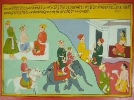 | Description / विवरण | Miniature painting based on Mahabharat - Rajdharma parva depicting Bhishma is telling about do s and don t near a king. He says that spitting while talking to king, sitting on horse or elephant of king, laughing vigourously, sitting without permission and not satisfied by wealth given by him is not permitable. |