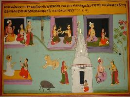 | Description / विवरण | Miniature painting based on Kashi khand depicting advantages of performing fast and disadvantages of quarrelling with others and not following the lessons of Bharat. A boar and a lion is also depicted with a Shiv temple. |