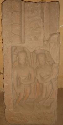 | Description / विवरण | Architectural fragment depicting a male and female figure. The male is holding a bowl in left hand and right hand is in Kartavyalambit mudra. The female is holding a pitcher with both hands. Tussels of both figure are clearly visible and both of them are heavily ornamental. |
