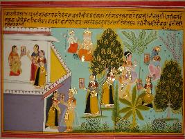 | Description / विवरण | Miniature painting based on Sanskrit drama Malti Madhav depicting Madhav holding portrait of Malti and sitting with Kalhans at top left, Below it, Makarand is depicted giving Madhav s portrait to Malti s friend. She is shown talking it to Malti, At the right part, Malti is shown holding his portrait in front of her friends inside police. At the top, Kamdev is sitting with God Brahma. |