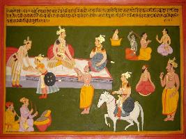 | Description / विवरण | Miniature painting based on Prithviraj Raso depicting after getting boon from Shiv, Atatai coming back and meeting Anangapala and describing him everything in detail. At one side, poet Chandvardai describing the same thing to king Prithviraj. |