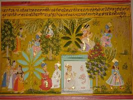 | Description / विवरण | Miniature painting based on Sanskrit drama Malti Madhav depicting Makarand talking to Malti that when he and Madhav are preparing garland, Lawangika arrived and ask them for it and they gave garland to her. |