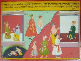 | Description / विवरण | Miniature painting based on Mahabharat - Rajdharma parva. Where Bhishma says to the king about the story of Brihaspati and Sagar. The painting also depicts as both scene of two boy while Bhishma and the king is seen in the upper right side of the painting. |