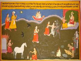 | Description / विवरण | Miniature painting based on Kashi khand depicting some scenes of the purity of women. The painting says that there are different types of punishment for man who is not loyal to his wife. |