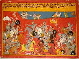 | Description / विवरण | Miniature painting based on Prithviraj Raso depicting vigorous fight between the army of Prithviraj and Jaichand. At the upper part Devtas are also fighting with demons. Devtas offering flowers to the dead. |