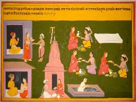 | Description / विवरण | Miniature painting based on Kashi khand depicting some scene of household life of a woman. The painting shows how to serve her husband and child, and taking bath in the early morning and making different kinds of donation. |