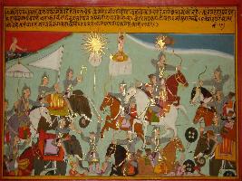 | Description / विवरण | Miniature painting based on Prithviraj Raso depicting vigorous fight between the army of Prithviraj and Jaichand. Prithviraj eloping with Sanjogita, daughter of Jaichand, who are seen at the left side, protected by their army. |