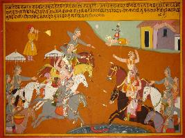 | Description / विवरण | Miniature painting based on Prithviraj Raso depicting fighting scene between the army of Jaichand and the nobles of king Prithviraj. Army of Jaichand throwing arrows towards Prithviraj. |
