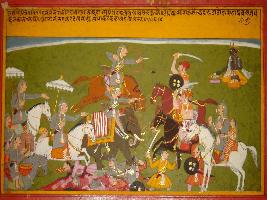 | Description / विवरण | Miniature painting based on Prithviraj Raso depicting battle scene between the army of Jaichand and nobles of Prithviraj, who is depicted with Sanjogita. Loss of human life and blood spread on the field are also depicted. |