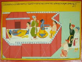 | Description / विवरण | Miniature painting based on Mahabharat - Rajdharma parva depicting Narayan is sleeping on bed and woke up in the evening and start praying. He is also depicted performing daan. |