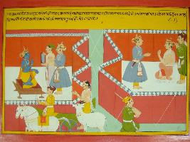 | Description / विवरण | Miniature painting based on Mahabharat - Rajdharma parva depicting Krishna donating cows to Brahmans and taking their blessings. In other part Satyiki is depicted in front of Yudhisthir with folded hands. |