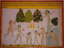 | Description / विवरण | Miniature painting based on Kashi khand depicting Dhruv in the centre in meditation pose. Many demons are trying to break his meditation by making fire or applying other terrible methods but they do not get success. |