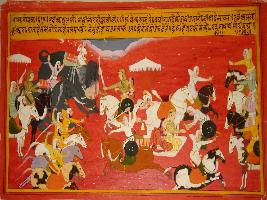 | Description / विवरण | Miniature painting based on Prithviraj Raso depicting Prithviraj moving on horseback with Sanjogita. On their way, they get down from horse to drink water and again move ahead. |
