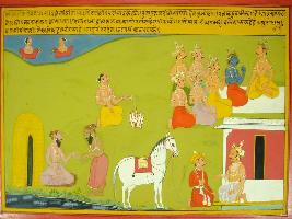 | Description / विवरण | Miniature painting based on Mahabharat - Rajdharma parva. The painting depicts Yudhisthir talking with his brother about the Khatriya dharma. The painting says to take path in the Nina and perform devpuja. The painting again says that the king who does not follow the roles of the creation is not a good king. |