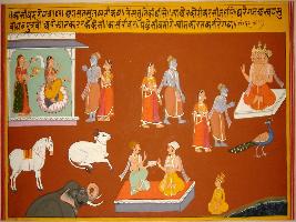 | Description / विवरण | Miniature painting based on Kashi khand depicting Lakshmi sitting on lotus with female attendant and talking to sage Agastsya and his wife to its left, they are shown leaving and at upper left part, they are talking to 6 headed king seated near Ganga river. At the lower right horse, cow and elephant are depicted. In the lower middle part, two men are discussing. |