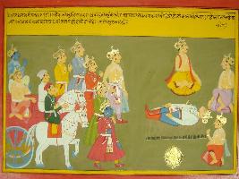 | Description / विवरण | Miniature painting based on Mahabharat - Rajdharma parva depicting Yudhisthir is asking Arjun to prepare chariot and then they drove to meet Bhishma who is lying on bed of arrows. |