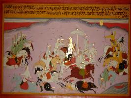| Description / विवरण | Miniature painting based on Prithviraj Raso depicting Prithviraj attacked by army of Panga and peoples are helping him. In other part, army of Ghauri is depicted attacking on Prithviraj. |