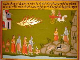 | Description / विवरण | Miniature painting based on Kashi khand depicting Agastsya walking with his wife and a king falling at his feet. He bestowed him and moved ahead. In upper left part, a divya purush on Chariot is depicted. |