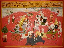| Description / विवरण | Miniature painting based on Prithviraj Raso depicting war between armies of Prithviraj and Ghauri and it is comparison with war between Chaturangi sena and demons. |