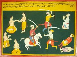 | Description / विवरण | Miniature painting based on Mahabharat - Rajdharma parva depicting that Dona study and penance are duties of Brahmans war and rule are duties of Kshatriya and but Guru dharma is supreme of all the duties. |
