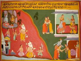 | Description / विवरण | Miniature painting based on Kashi khand depicting Agastsya worshipping Lakshmi, Ganesh and Bhavani. In right part, Bhavani coming down from Kailash. |