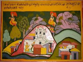| Description / विवरण | Miniature painting based on Sanskrit drama Malti Madhav. In the centre a palace is depicted with three man in it, in the right side some homes with 2 women is depicted two flying celestial figures are depicted flying on both sides of the palace. |