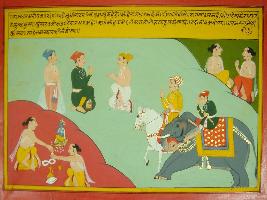 | Description / विवरण | Miniature painting based on Mahabharat - Rajdharma parva depicting Yudhisthir is talking to Bhishma and asking abut Rajdharma. Bhishma tells him that as rein for horse and ankus for elephant, Rajdharma is for kings. |