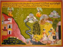 | Description / विवरण | Miniature painting based on Sanskrit drama Malti Madhav depicting a scene in some forest near a village. Madhav is depicted talking with two friends in the jungle and two celestial figure are flying, one on top of the forest and one on the village, a river is depicted coming out from a hill. |
