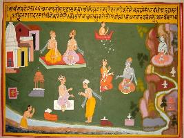 | Description / विवरण | Miniature painting based on Kashi khand depicting Lopamudra and Agastsya muni. Where Agastsya says about the results of doing meditation at Silalay Parvat. On the painting Shiv is seen in the left up corner and a noble is donating money to a person in the centre after performing Shiv Puja. |