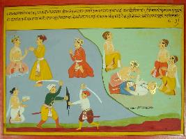 | Description / विवरण | Miniature painting based on Mahabharat - Rajdharma parva depicting at the left side Yudhisthir coming to meet Bhishma. Bhim blessed him and ask him to ask about dharma without any hesitation. At the right side, a king is talking to a man and two men are fighting with each other. |