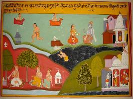 | Description / विवरण | Miniature painting based on Kashi khand depicting Agastsya Muni talking to Lopamudra. Around them Ayodhya city is depicted with Ram and Sita sitting on his palace, Ganga river is depicted at lower right part and on her bank, two sages are shown discussing, At the middle Sindhu river is depicted with a man talking bath and at upper right Kurukshetra is depicted with a man running toward Ganga river. By visiting these place one can get moksha. |