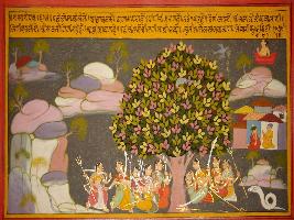 | Description / विवरण | Miniature painting based on Prithviraj Raso depicting many Goddesses holding sword and trishul under a tree. The tree is surrounded by hills, a Goddess is depicted holding a beheaded head, and an eagle is depicted eating a head of man sitting on tree. A village is also depicted with two people talking. A five hooded snake is also depicted. |