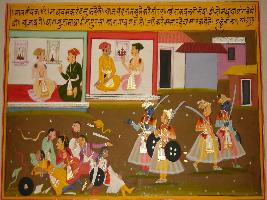 | Description / विवरण | Miniature painting based on Sanskrit drama Malti Madhav depicting in the upper part Madhav and Makarand talking with each other, below few people lying dead on the ground both Madhav and Makarand standing and talking with each other and then leave. It is an incomplete painting. |