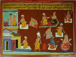 | Description / विवरण | Miniature painting based on Kashi khand depicting Agastsya rishi telling Lopa that once there was a Brahman in Mathura named Devsar, He was having 5 sons and eldest was Shivdar. He was devoted to worship and worshipped Brahma, Vishnu and Bhavani. |