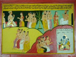| Description / विवरण | Miniature painting based on Mahabharat - Udyam parva. It depicts gods reaches to Indrani and Brihaspati and ask about thought of Brihaspati in context to Indrani and Nidhukh. Then Indrani moves with king Nidhukh for one month. |