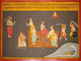 | Description / विवरण | Miniature painting based on Prithviraj Raso depicting when the sage decide to enter in fire alter at that time Narad arrives and stopped him. The sage washed the feet of Narad and the sage dropped the decision of entering in fire alter. At the lower left corner Sheshshyayi Vishnu is depicted. |