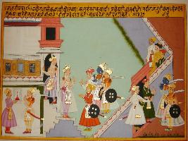 | Description / विवरण | Miniature painting based on Sanskrit drama Malti Madhav. It describe about the arrival of Madhav and Makarand at the Raj Mahal for the purpose of meeting Malti. It is an incomplete painting. |